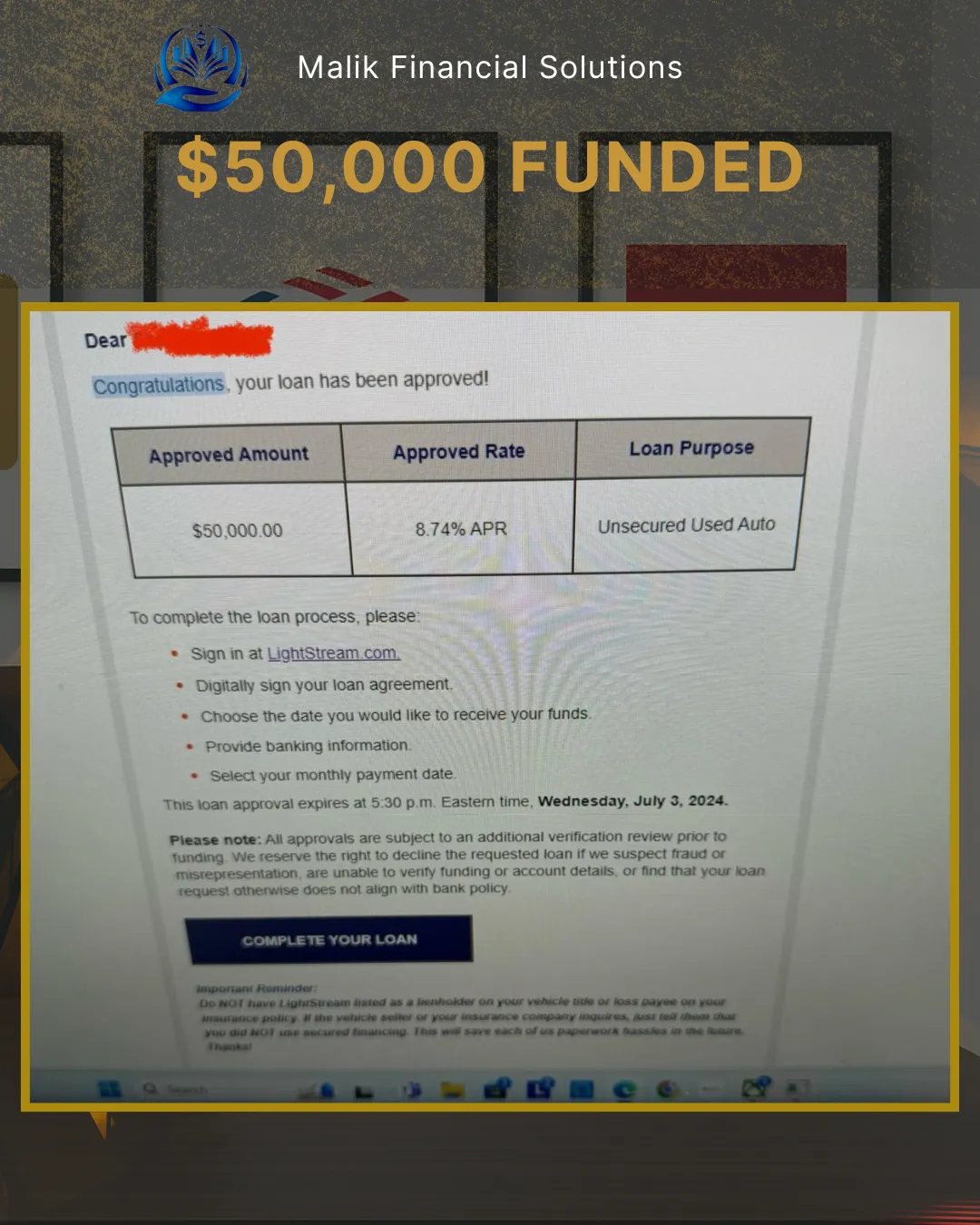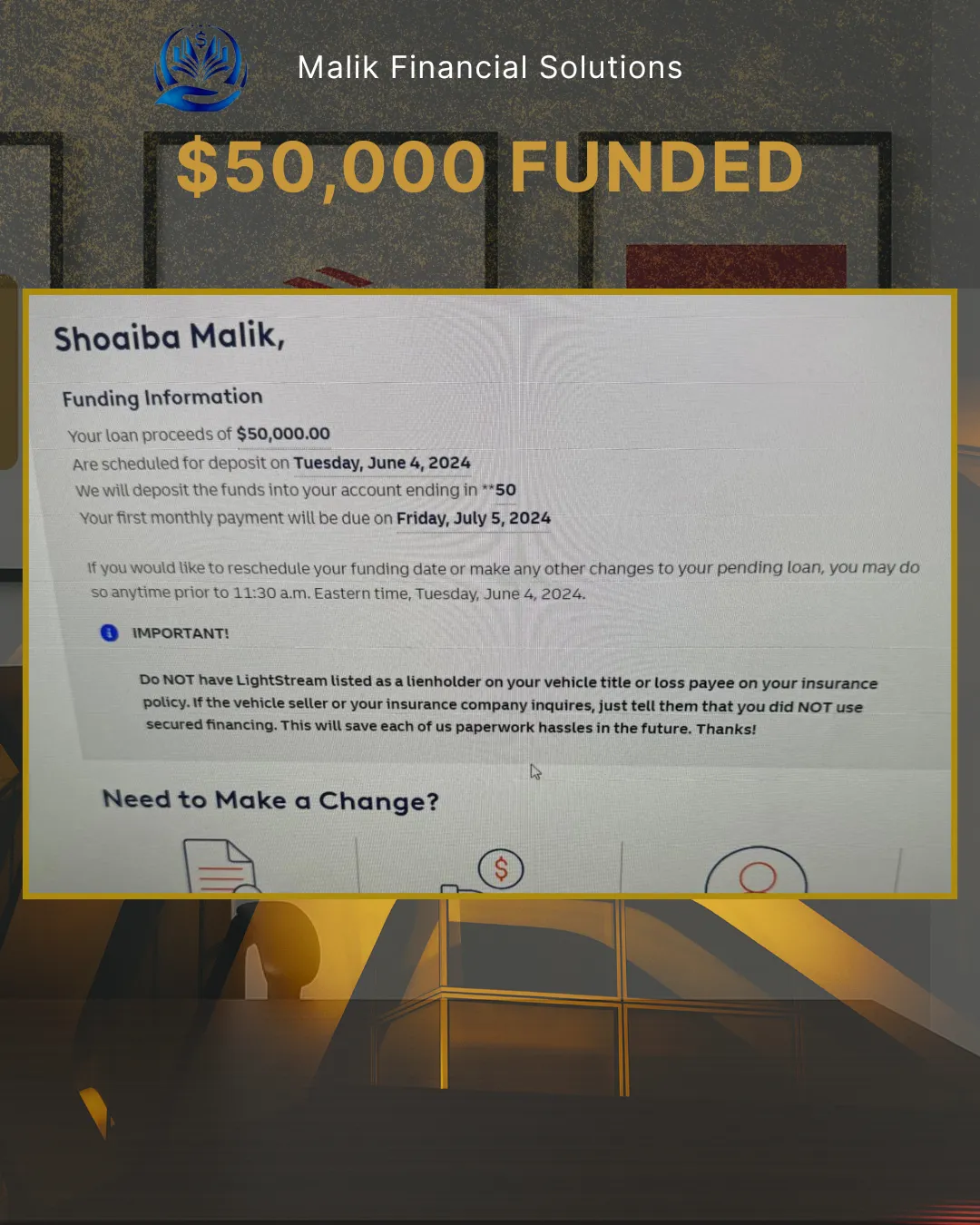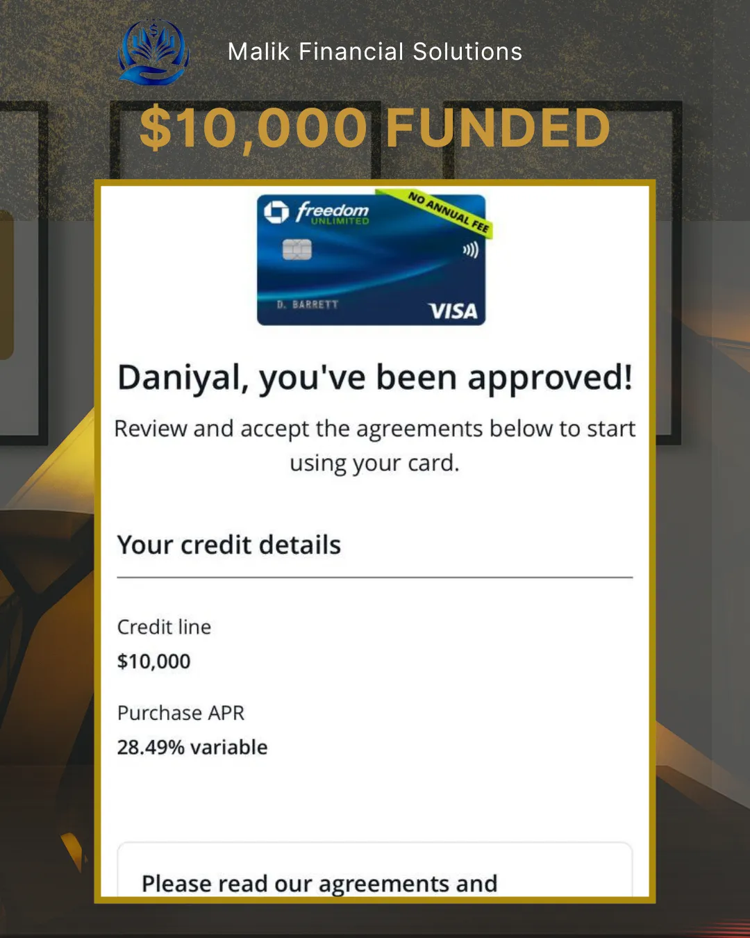 From Denied Loans to Approved! “Securing funding felt overwhelming until I worked with Malik Financial Solution. They helped me get approved for a $250,000 line of credit and a $20,000 business credit card. The process was straightforward, and their guidance made everything stress-free. This funding is already helping me scale my business faster than I imagined.”